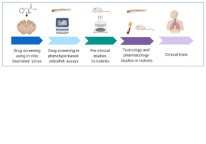 To accelerate drug discovery, we use high-throughput gene and drug screening platforms in zebrafish models of respiratory depression and analgesia. By using larval zebrafish, an animal model preserving the complex behaviors of vertebrates while allowing large-scale drug screening, we screen chemical library and identify effective pain killers without the side-effects of respiratory depression.
