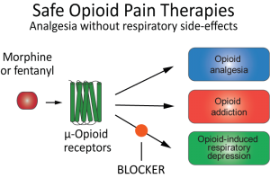 Our strategy is to identify molecular targets unique to respiratory depression by opioids so they can be targeted. Once a blocker of respiratory depression is identified, new opioid formulations can be designed to produce potent analgesia without the lethal side-effects of respiratory depression.